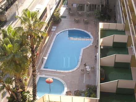 Blick vom Balkon auf den Pool. Zimmer 607
