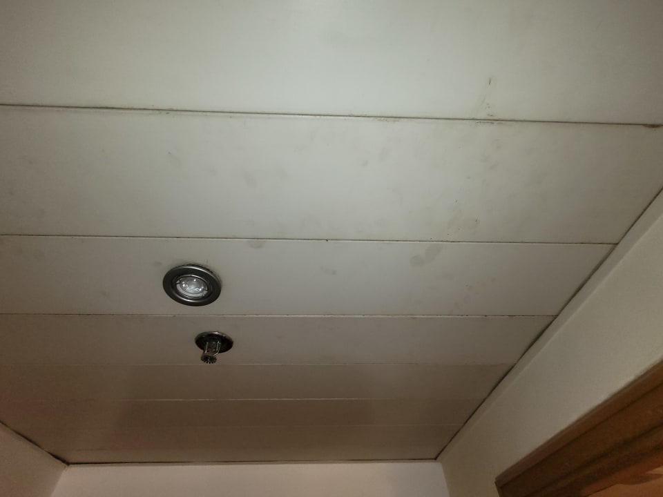 Sogar die Decke ist verschmutzt, Schuhabdrücke auf den vergilbten Paneelen