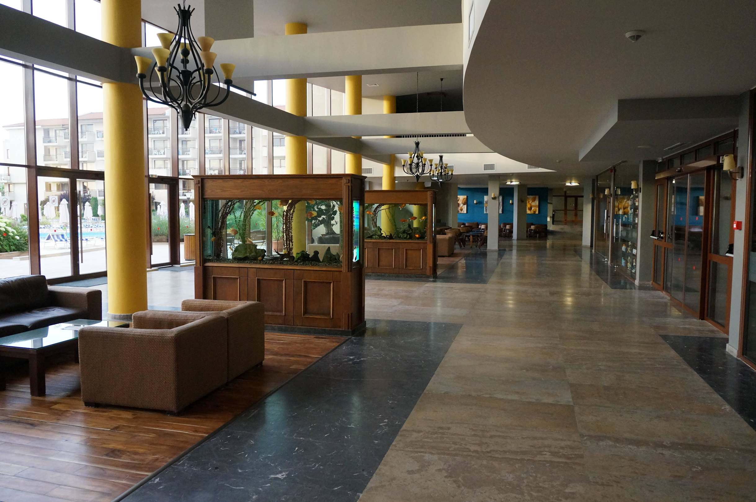 Viele Sitzgelegenheiten, 2 große Aquarien (dazwischen geht es durch die Glastür raus zum Pool und Strand), 2 Shops, Reiseleiter -Büro, hinten Lobby - Bar und Eingang zum Haptrestaurant