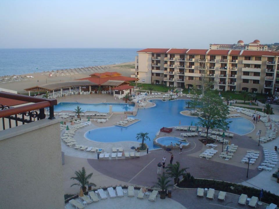 Foto aus einem Zimmer im 6 Stock auf die Poollandschaft und die Poolbar.