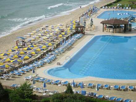 Blick vom Hotel auf Pool und Strand