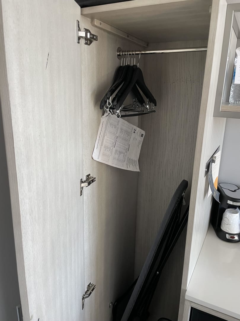 Schrank mit einigen wenigen Bügeln und Bügelbrett/eisen