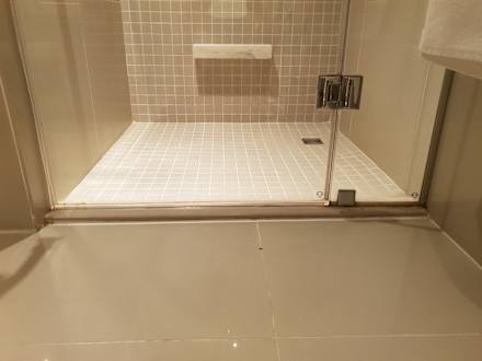 Blick vom WC-Sitz auf die verschimmelte und verkalkte Dusche
