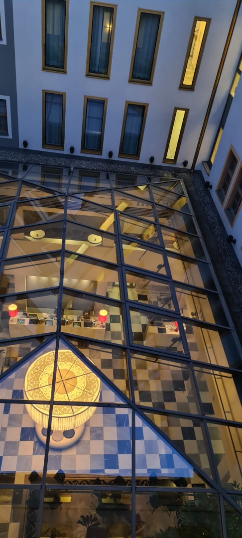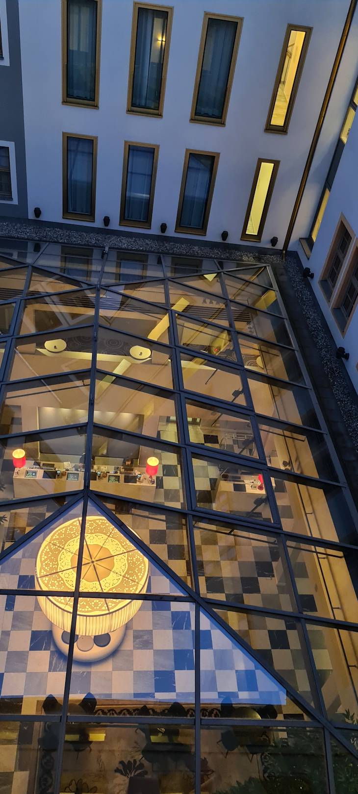Ausblick vom Hotelflur auf das Glasdach der Lobby