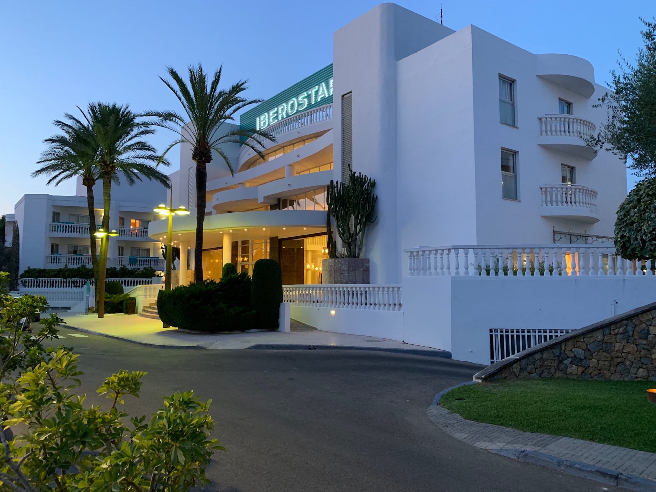 Iberostar Albufera Park, Außenansicht. Das Albufera Playa sieht fast identisch aus und liegt rechts daneben, danach kommt rechts noch ein kleiner Parkplatz, danach ist Hotelende und nur Pinienwald. Links weitere Hotels und Shops.