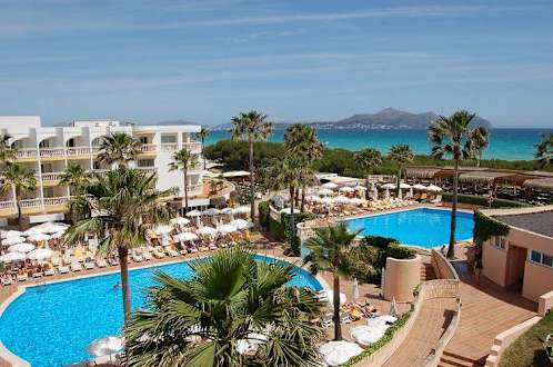 Pool & MeerAussicht vom obersten Stockwerk des Hotels Albufera Playa, Blick auf die Pool-Anlage und die Bucht von Alcudia.
