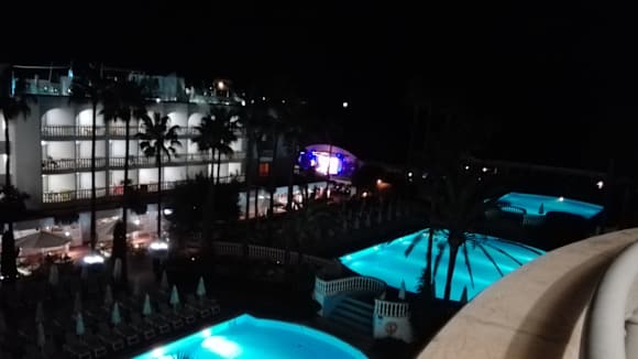 Poolblick bei Nacht und erleuchtete Showbühne