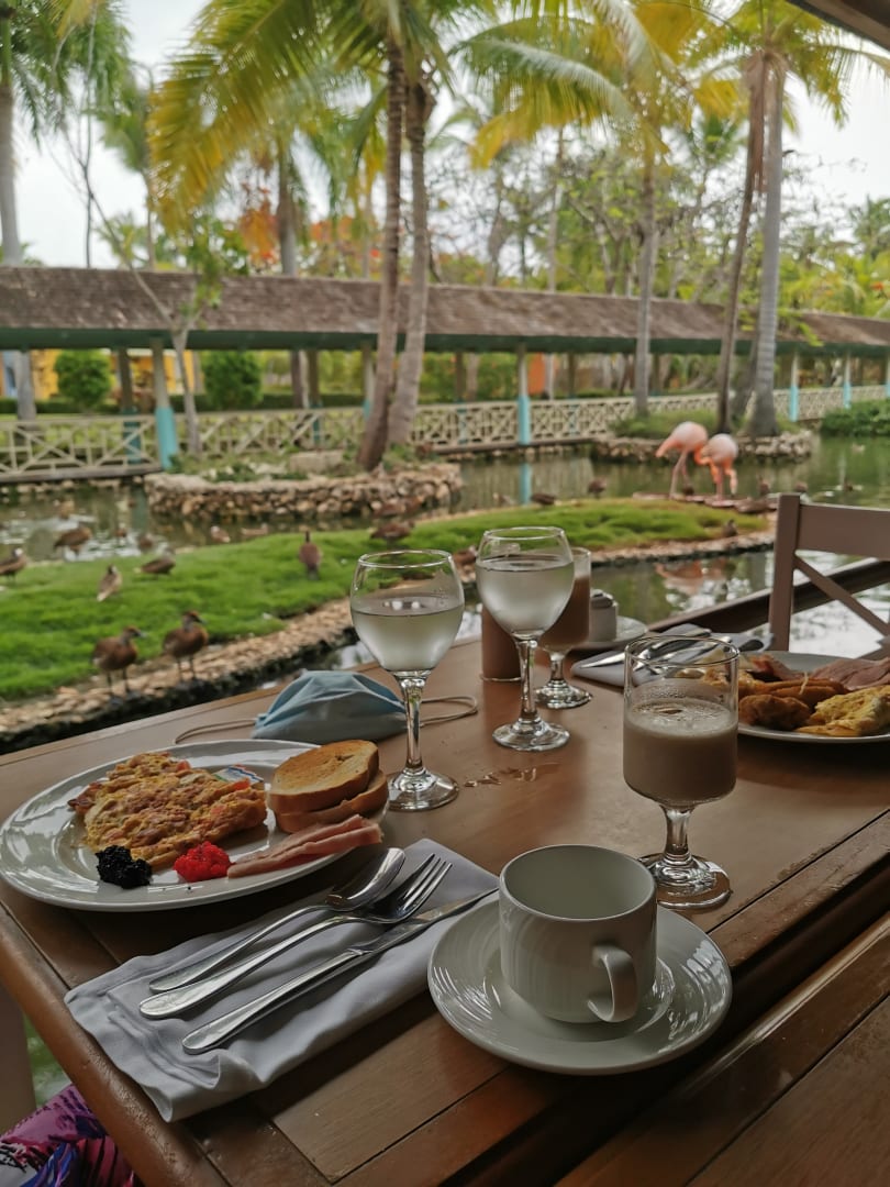 Der Frühstücksraum ist offen und drumherum ist ein Fischteisch inkl. Flamingos angelegt