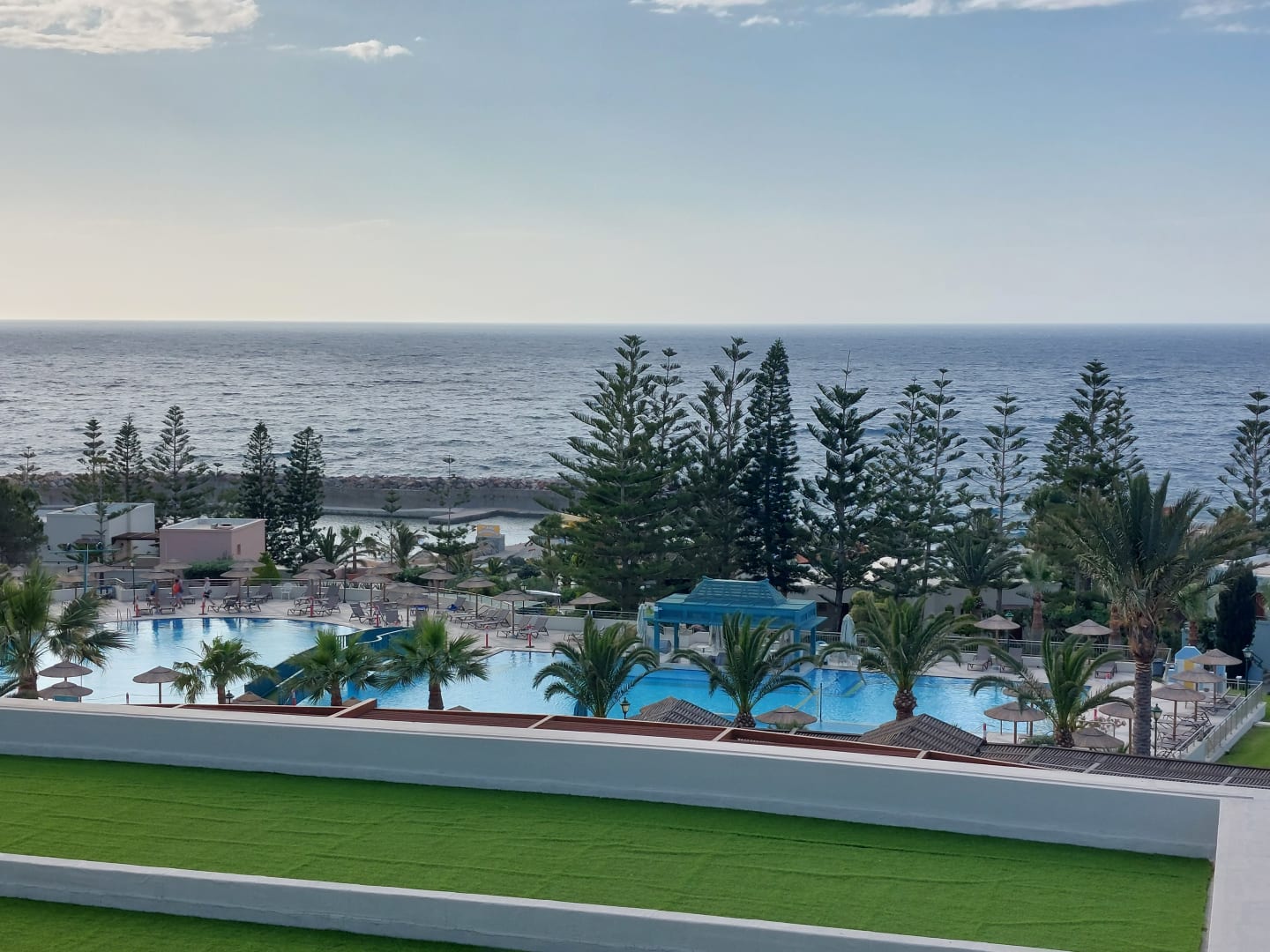 Blick vom Zimmer auf den Pool und da Meer