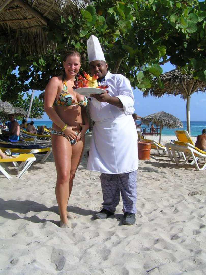 Früchtespieße am StrandDas nennt man Service. Die Köche gehen am Strand spazieren und verteilen leckere Früchtespieße