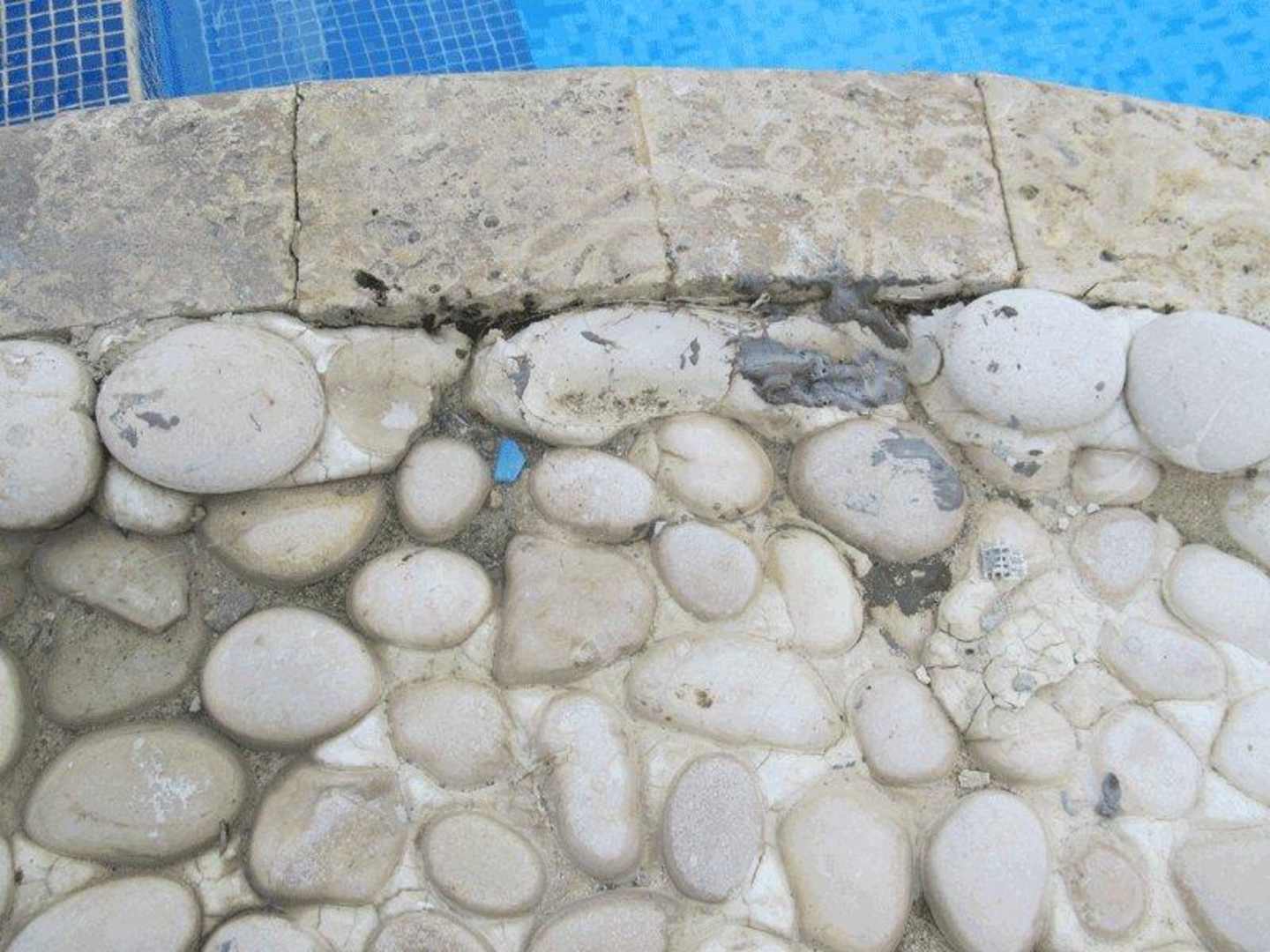 Man benutzte 2 Komponentenkleber und mischte diesen am Pool an. Sanach streifte man diesen einfach an den Steinen ab und lies Ihn trocknen (Graue auf dem Bild)
