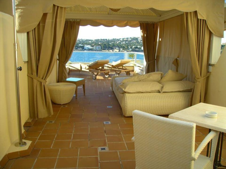 Sehr geräumig, mit Outdoor-Mobiliar wie Sonnenliegen, Sonnenzelt und Tischgarnitur ausgestattet sind die Terrassen, die zu den Suiten gehören.