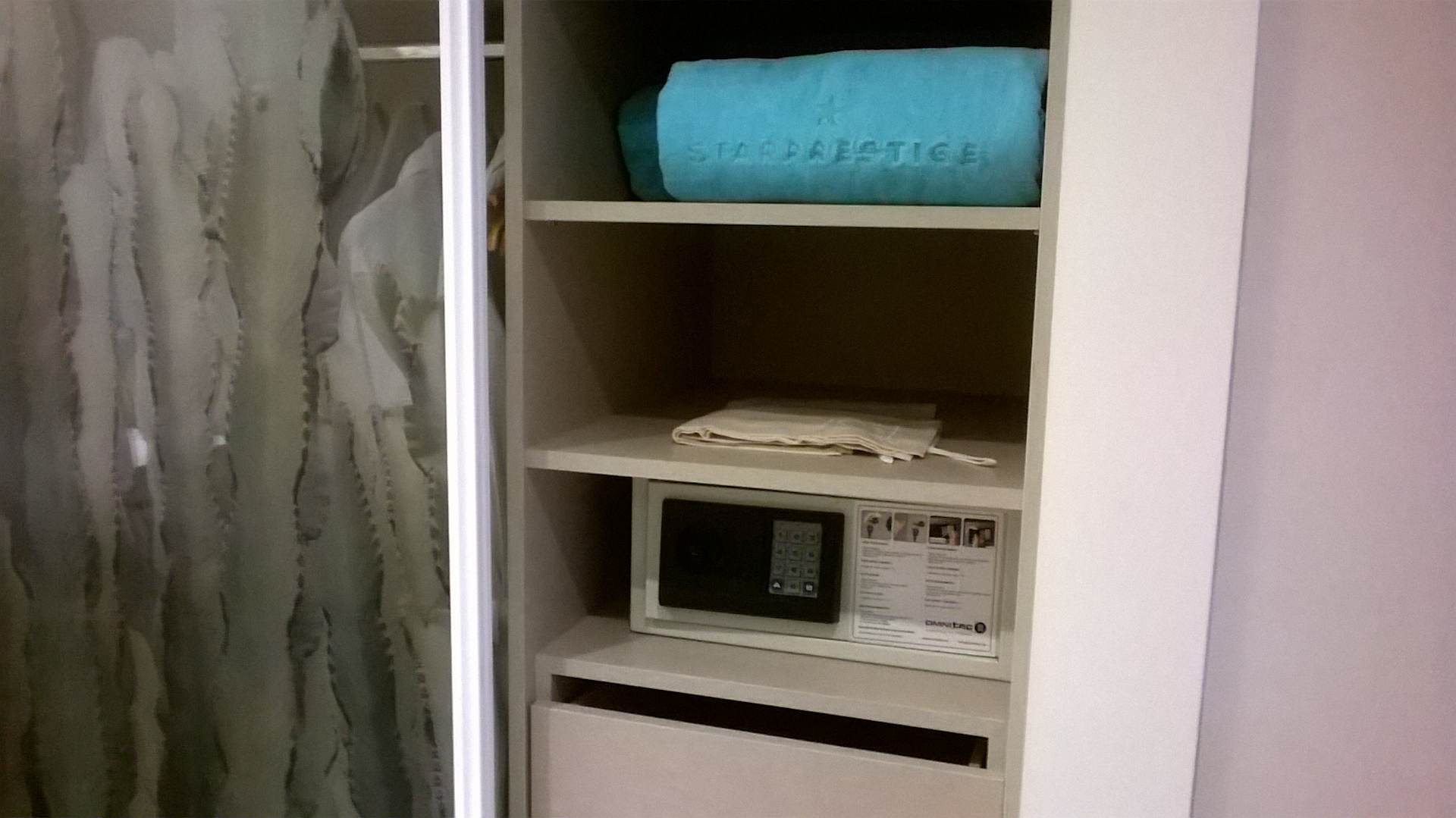 Teil des Kleiderschranks mit Safe und Pool-Handtüchern