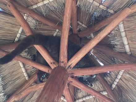 Nasenbär unterm Schirm am Pool