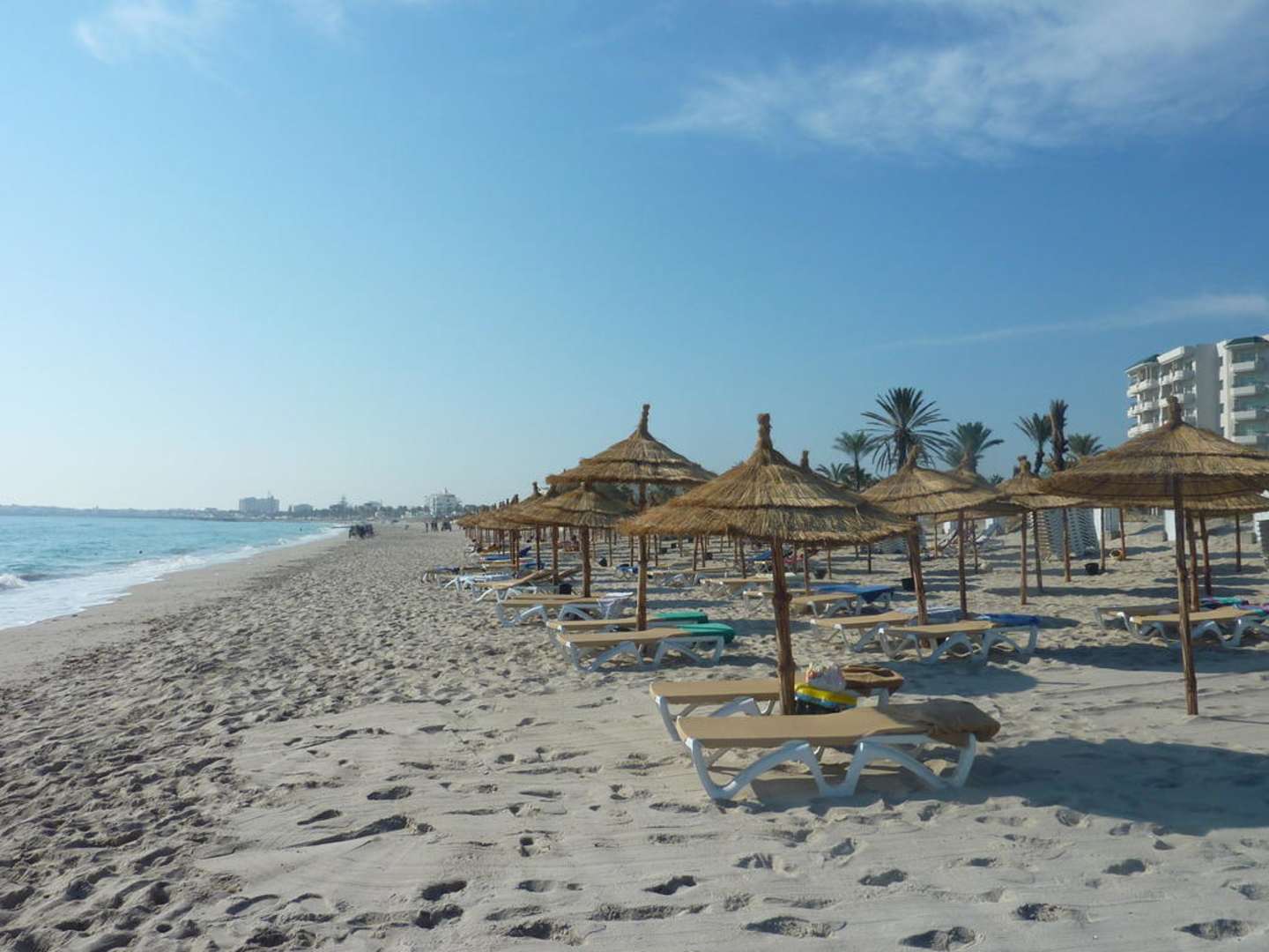 Strand mit Liegen und Sonnenschirmen