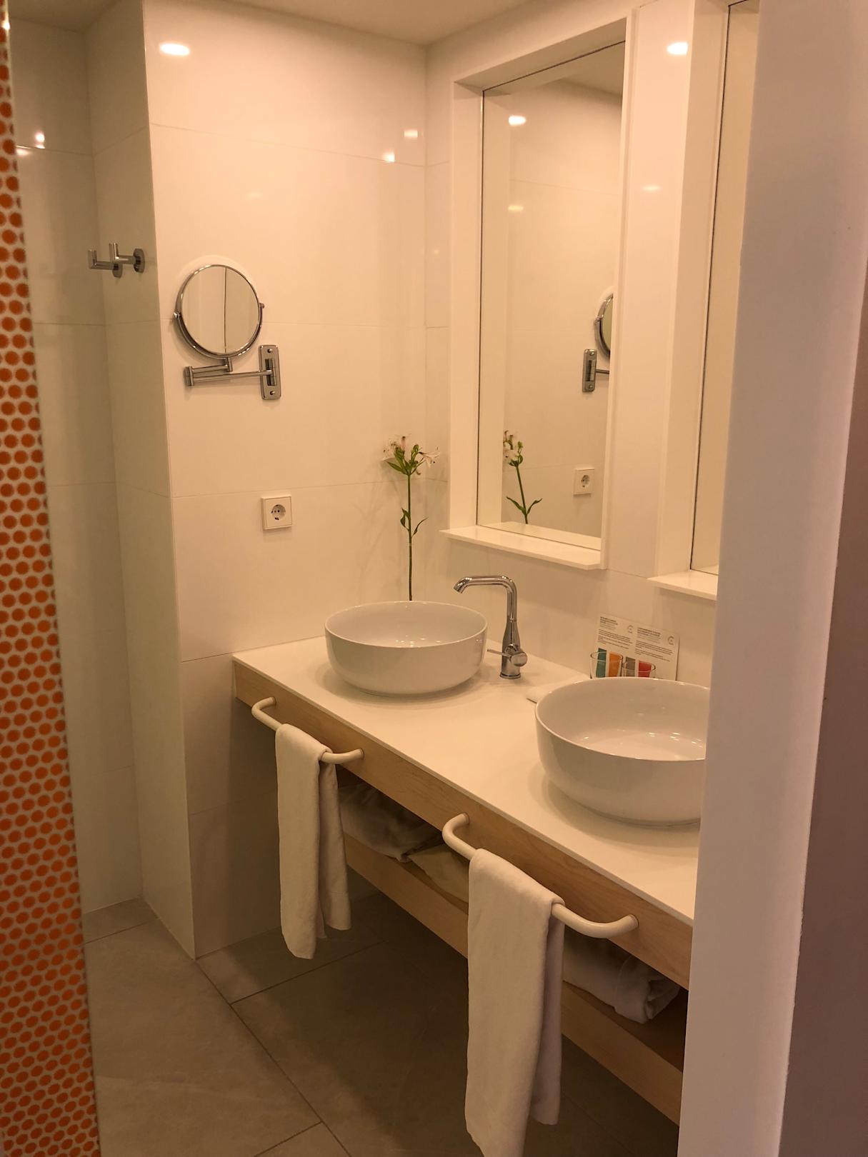 Schickes Bad mit Shampoo, Conditioner, Duschgel und bodylotion sowie Fön ausgestattet
