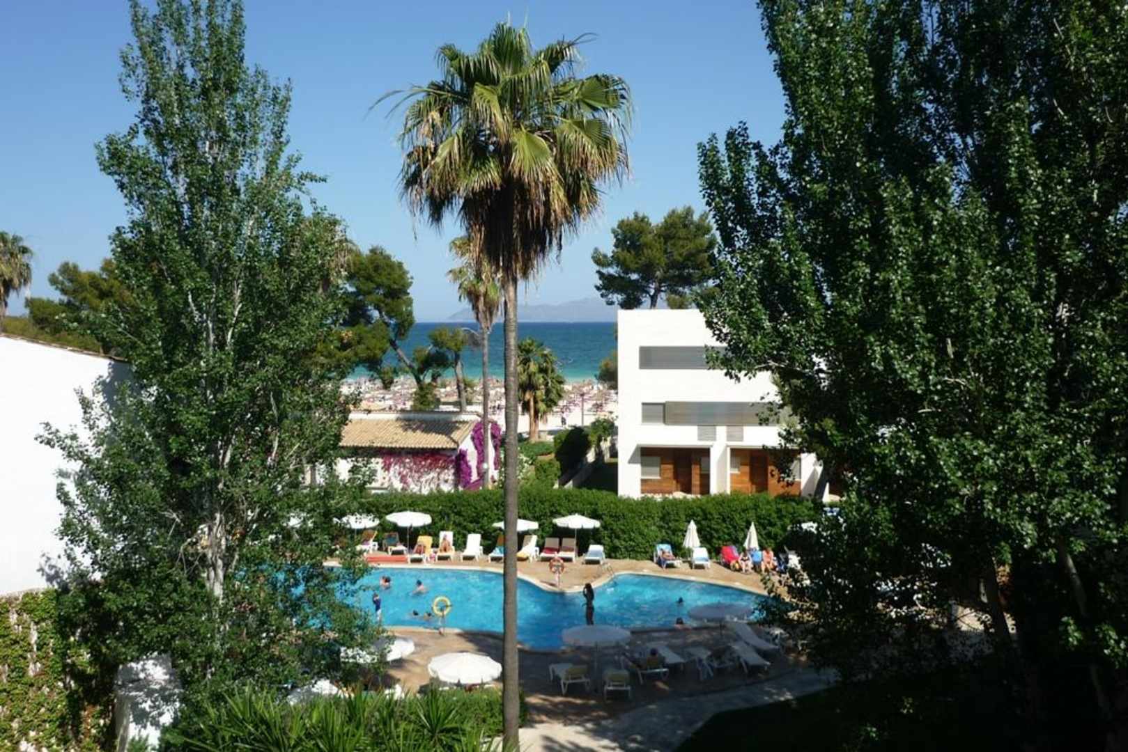Ausblick zur Gartenseite war gebucht, hinter dem Garten mit dem kleinen Pool für Schwimmer sah man sogar das Meer. Ein netter Zufall.