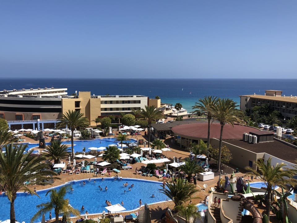 Blick vom Balkon auf Pools und Meer.