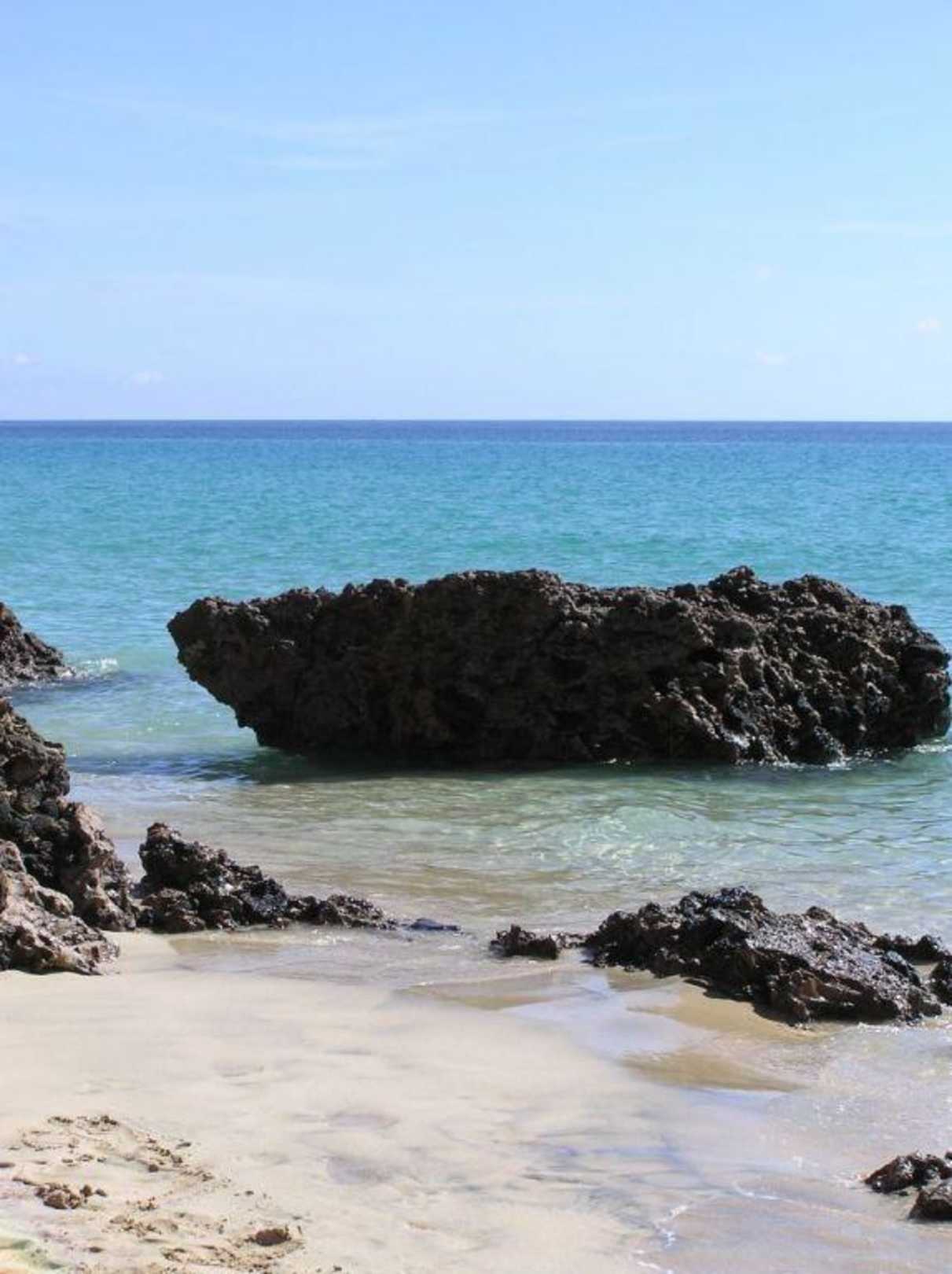 Felsen am StrandDiese Felsen im Wasser geben ein reizvolles Motiv ab. Ein paar Meter weiter links kann man prima baden (ohne Felsen und Steine).