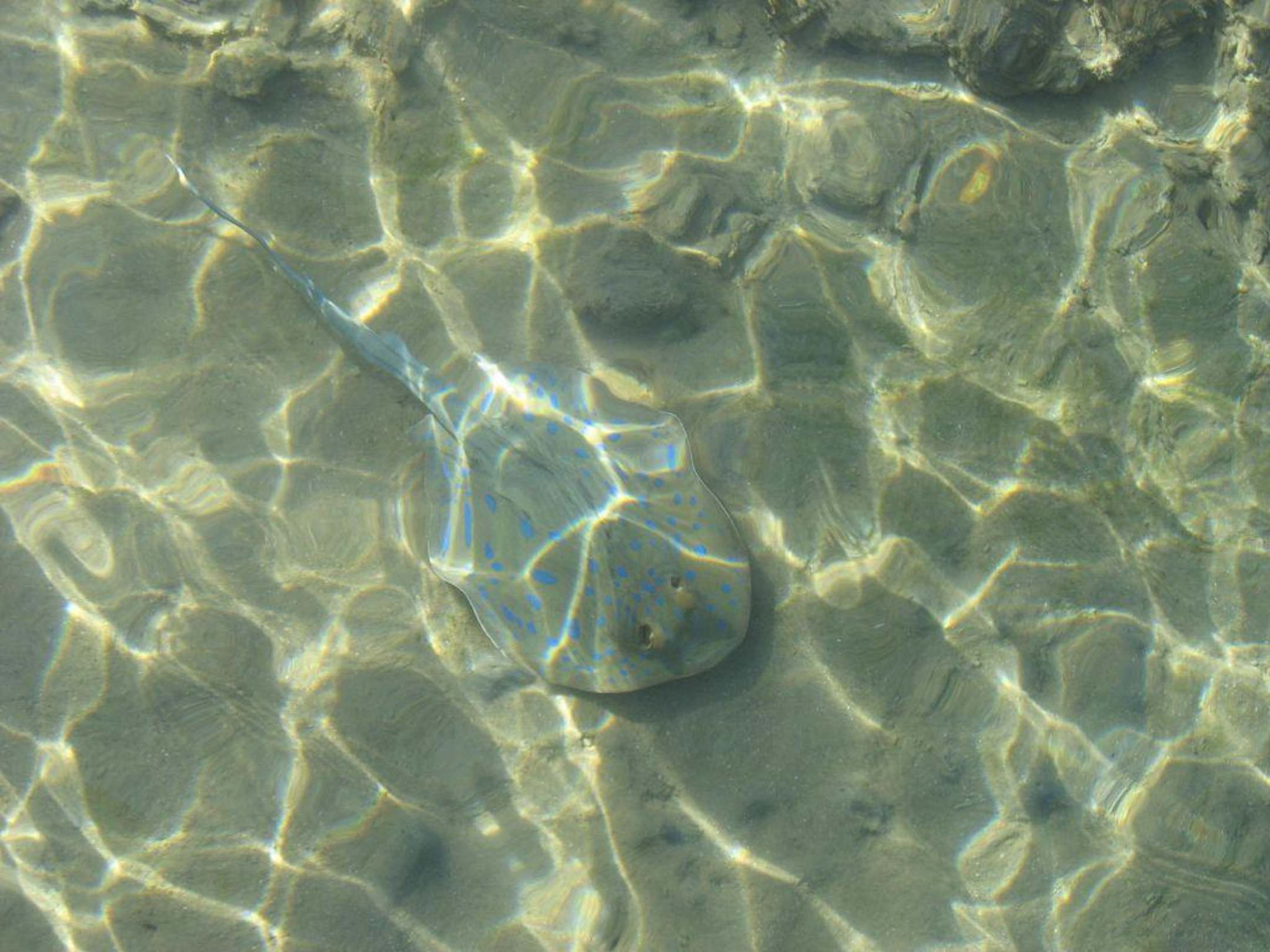 Aufnahme vom nahegelegenen Steg. Diese Art von Rochen sieht man aber immer wieder mal in der Nähe des Strands oder vor allem beim Riff
