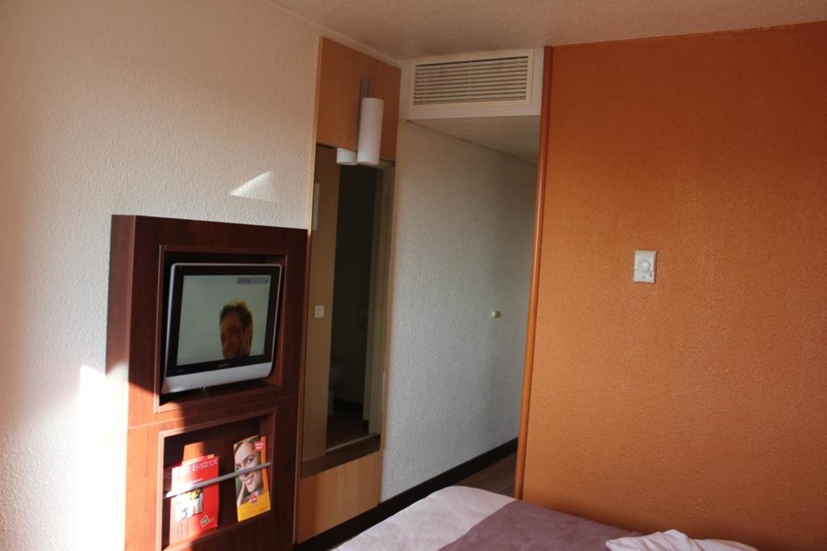 Das ist der Zimmereingang mit dem Eingebauten Flachbildschirm.