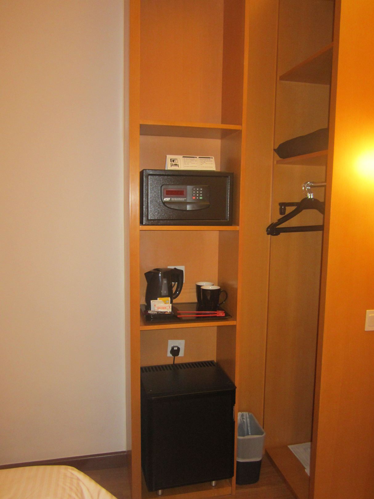 Kleiner Schrank mit Safe, Wasserkocher & Kühlschrank