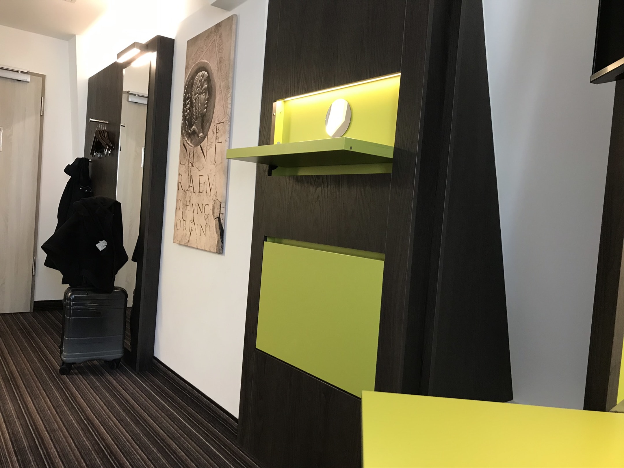Die grüne Fläche an der Wand ist eine ausklappbare Kofferablage.