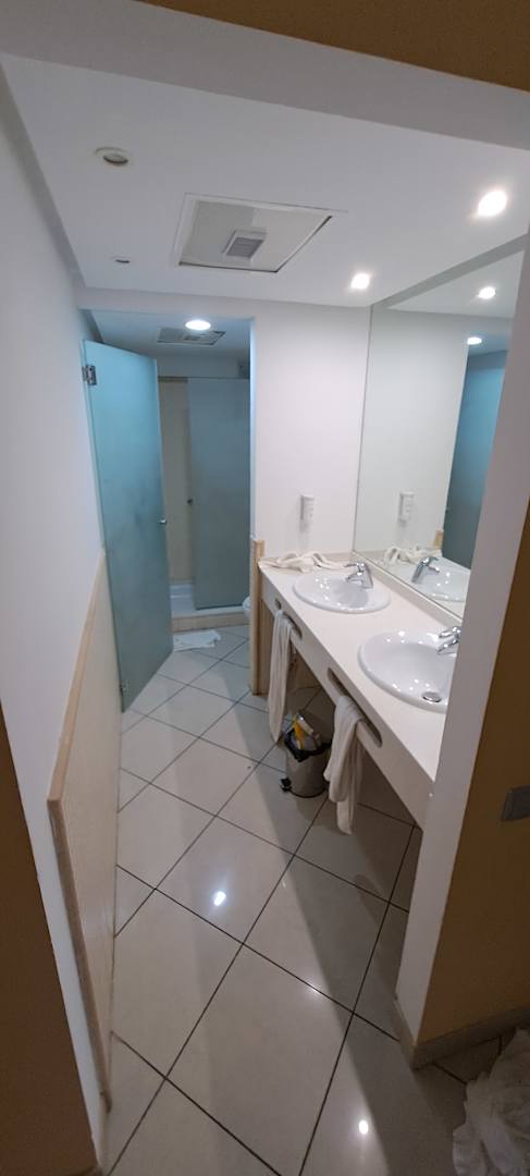 Keine Tür zum Bad und ein winziger Mülleimer im ganzen Zimmer. Keine Abluft im WC-Bereich.
