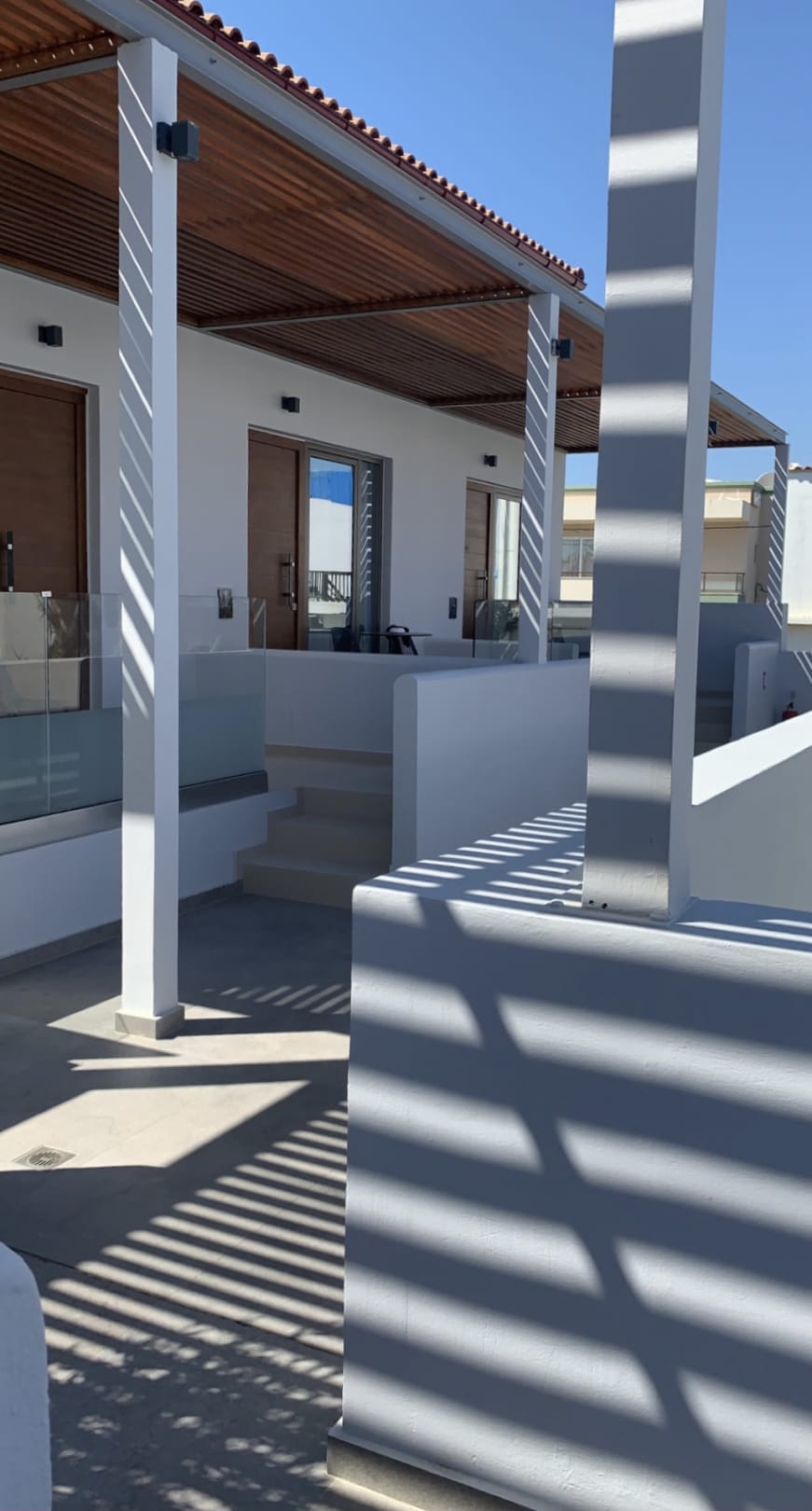 Die Zimmer auf der zweiten Etage mit Terrasse vor dem Eingang.
