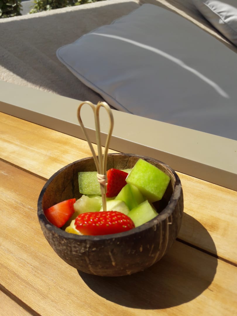 Essen und Trinken am Strand und Pool in umweltfreundlichen oder wiederverwendbaren Material.