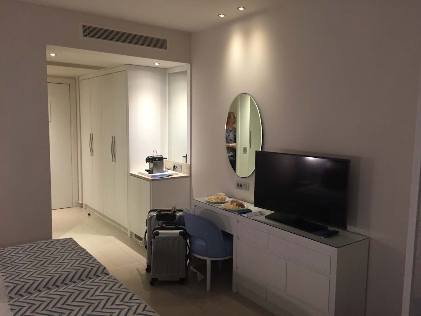 ZimmerFernseher von Samsung, Nespressomaschine, darunter MiniBar, Flurschrank mit Bügeleisen und Bügelbrett.