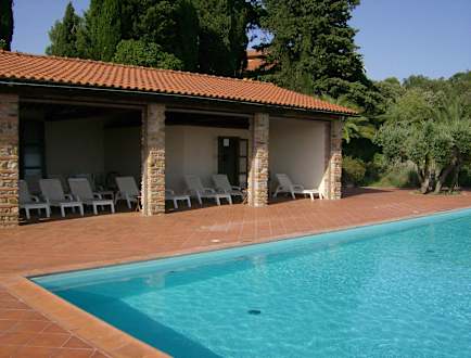 Großzügiger Poolbereich mit Blick zur Insel Elba