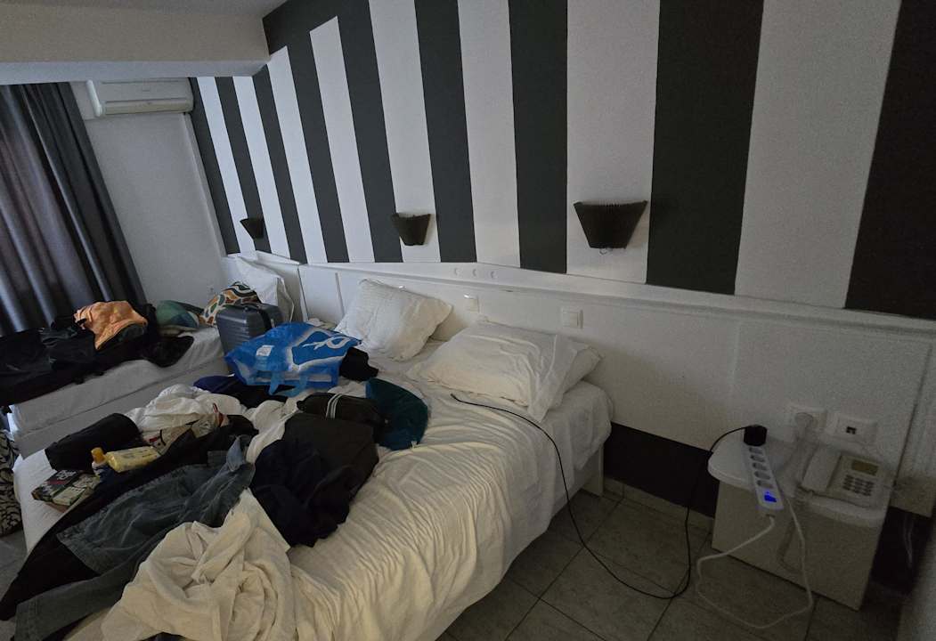 Das Zimmer. Der Nachttisch ist ein Witz, 1m vom Bett entfernt! Das Mobiliar sehr abgewohnt.
