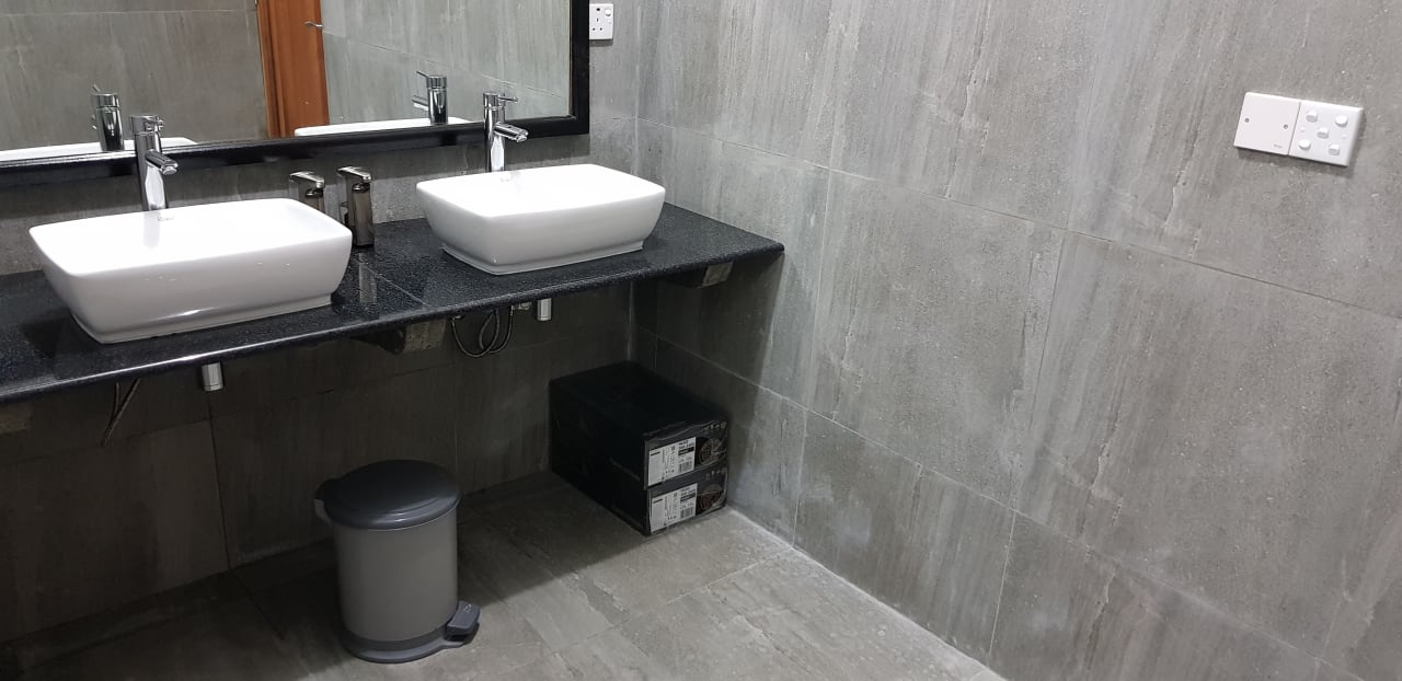 Eingepackte Händelufttrockner unter dem Waschtisch im WC der Bar