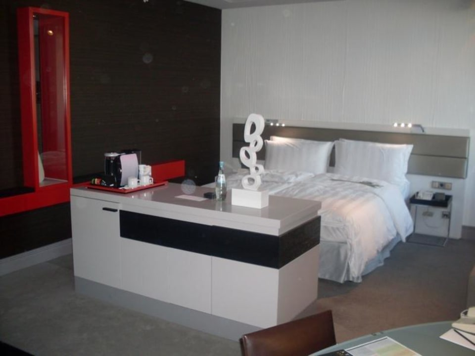 Im Vordergrund Minibar mit Tassimo-Maschine und Zubehörfächern.