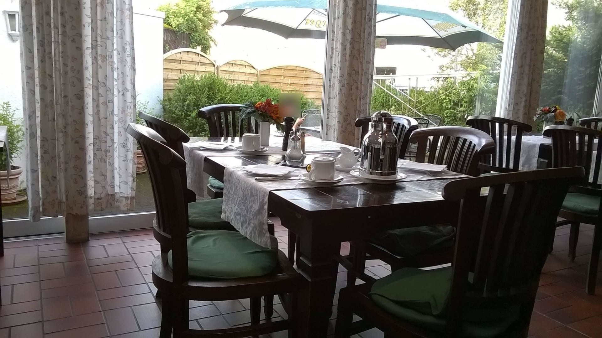 Frühstücksraum, Blick auf Außenterrasse