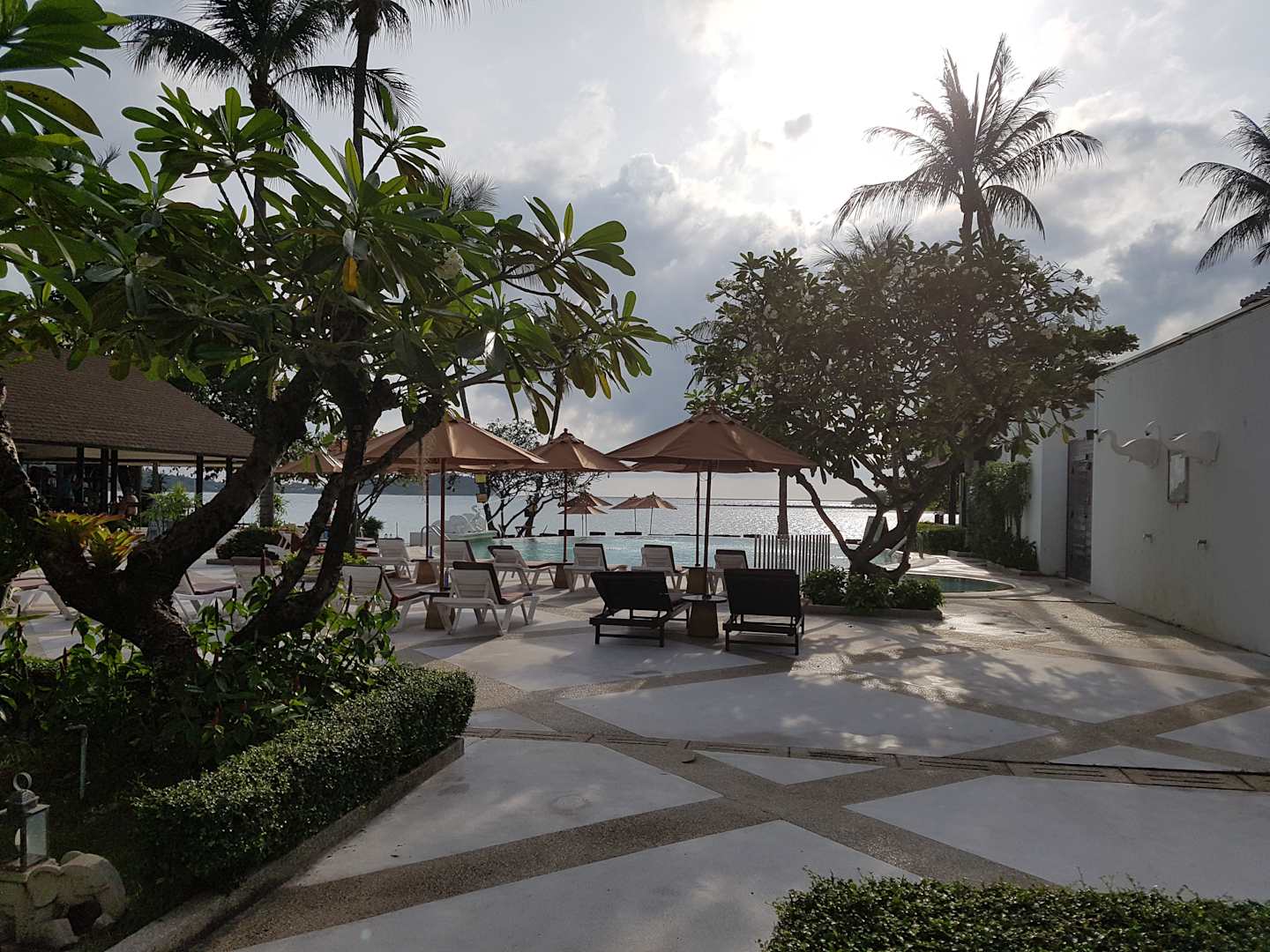 Pool und Strand aus Sicht des Haupthauses