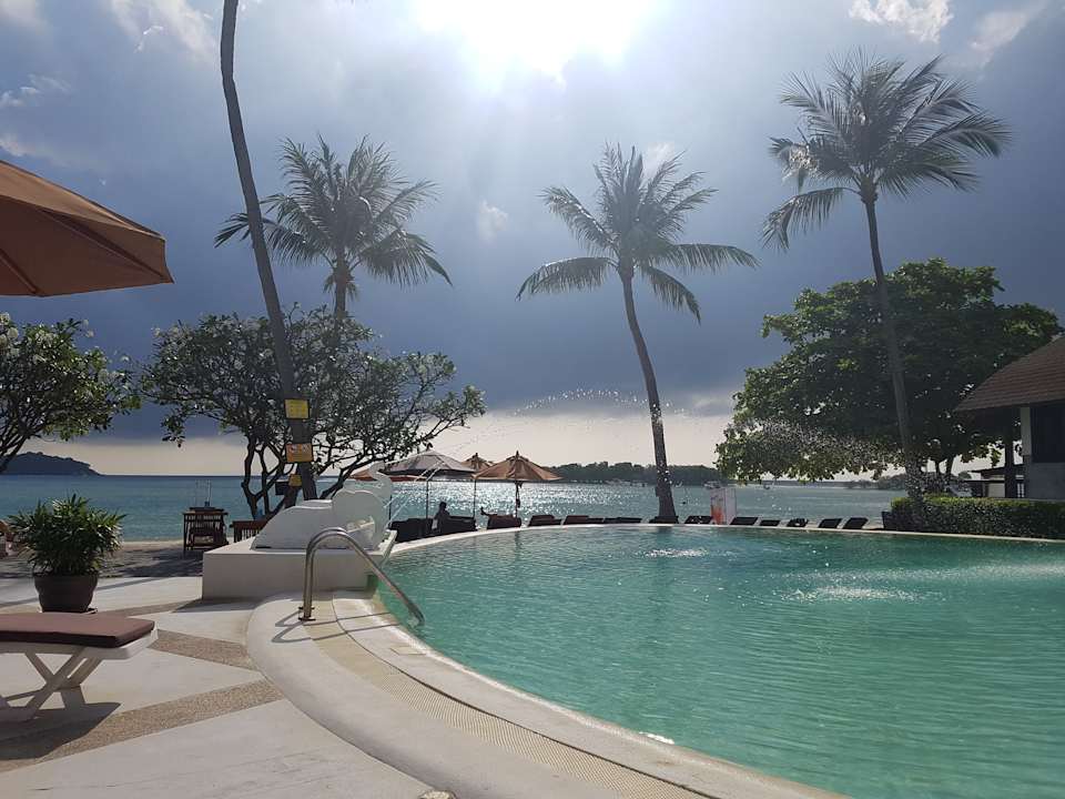 Blick über den Pool auf die Bucht