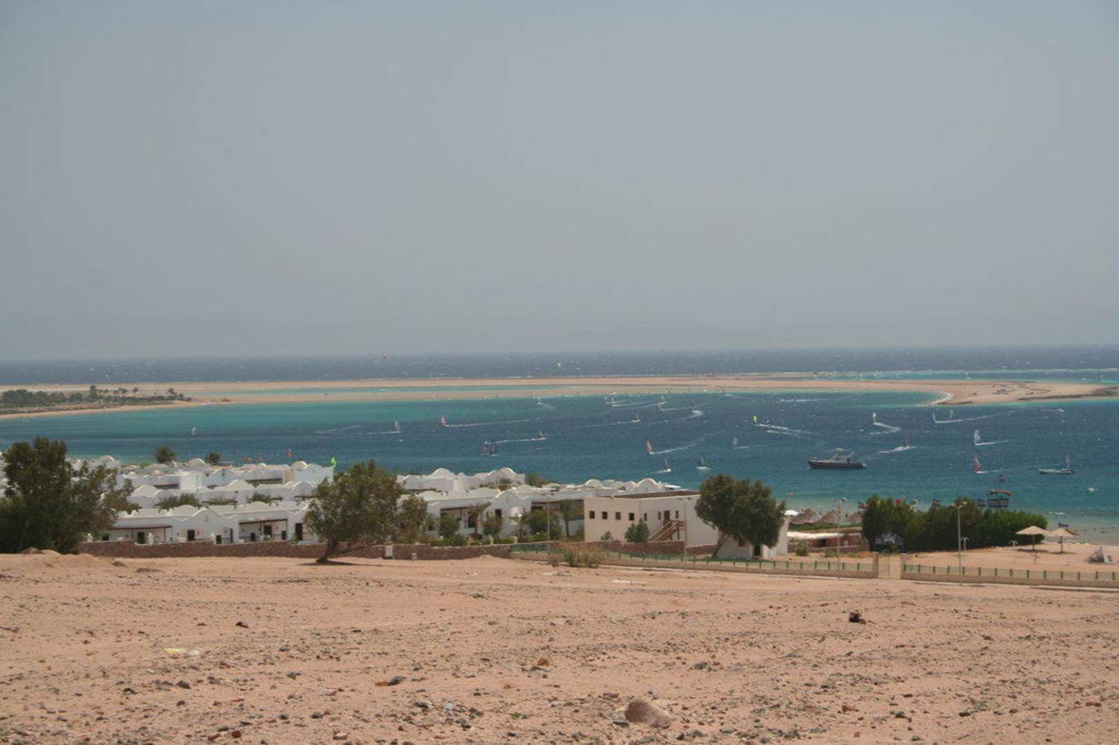 Blick auf die Bucht vor dem Hotel mit der Lagune. Markant die Segel der Windsurfer.
