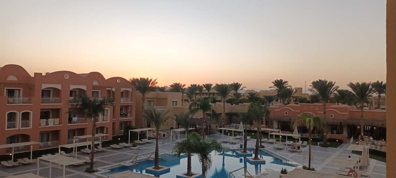 Blick vom Zimmer auf den Pool