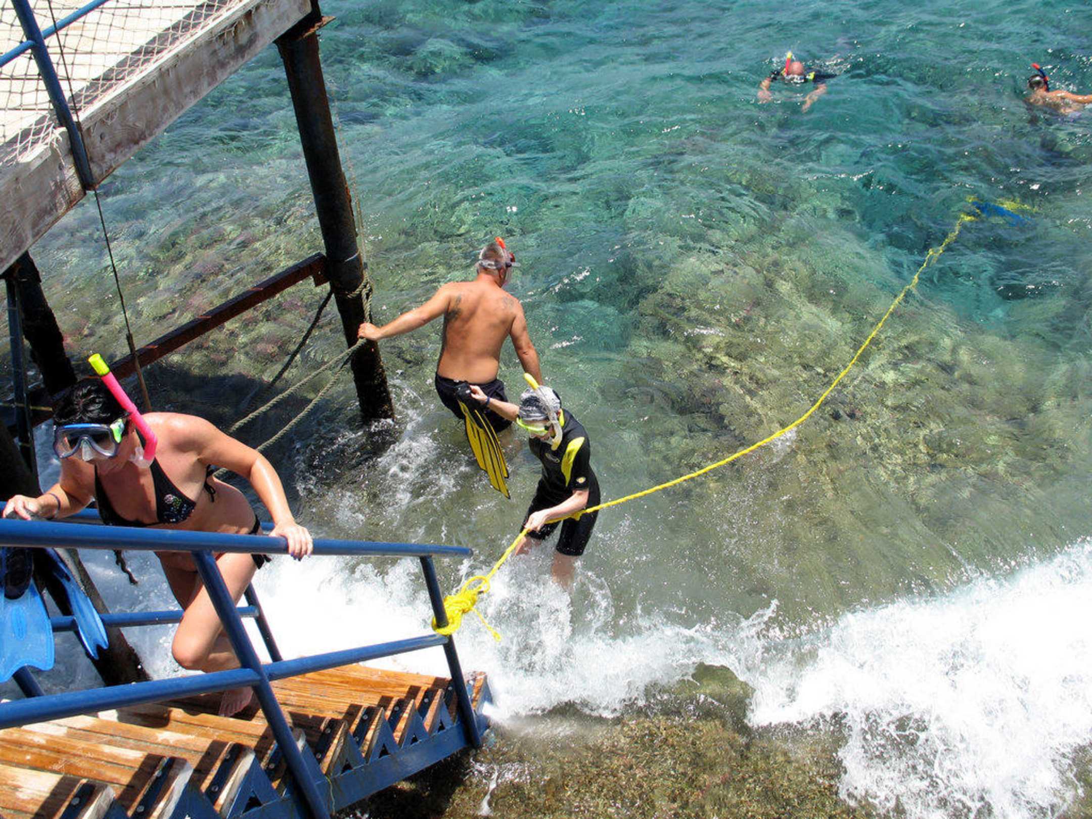 L'escalier escamotable du ponton se trouve juste à l'endroit ou les vagues retombent, c'est très dangereux. Il faut regarder les maitres nageurs pour savoir quand il faut essayer de sortir sans trop de risques;