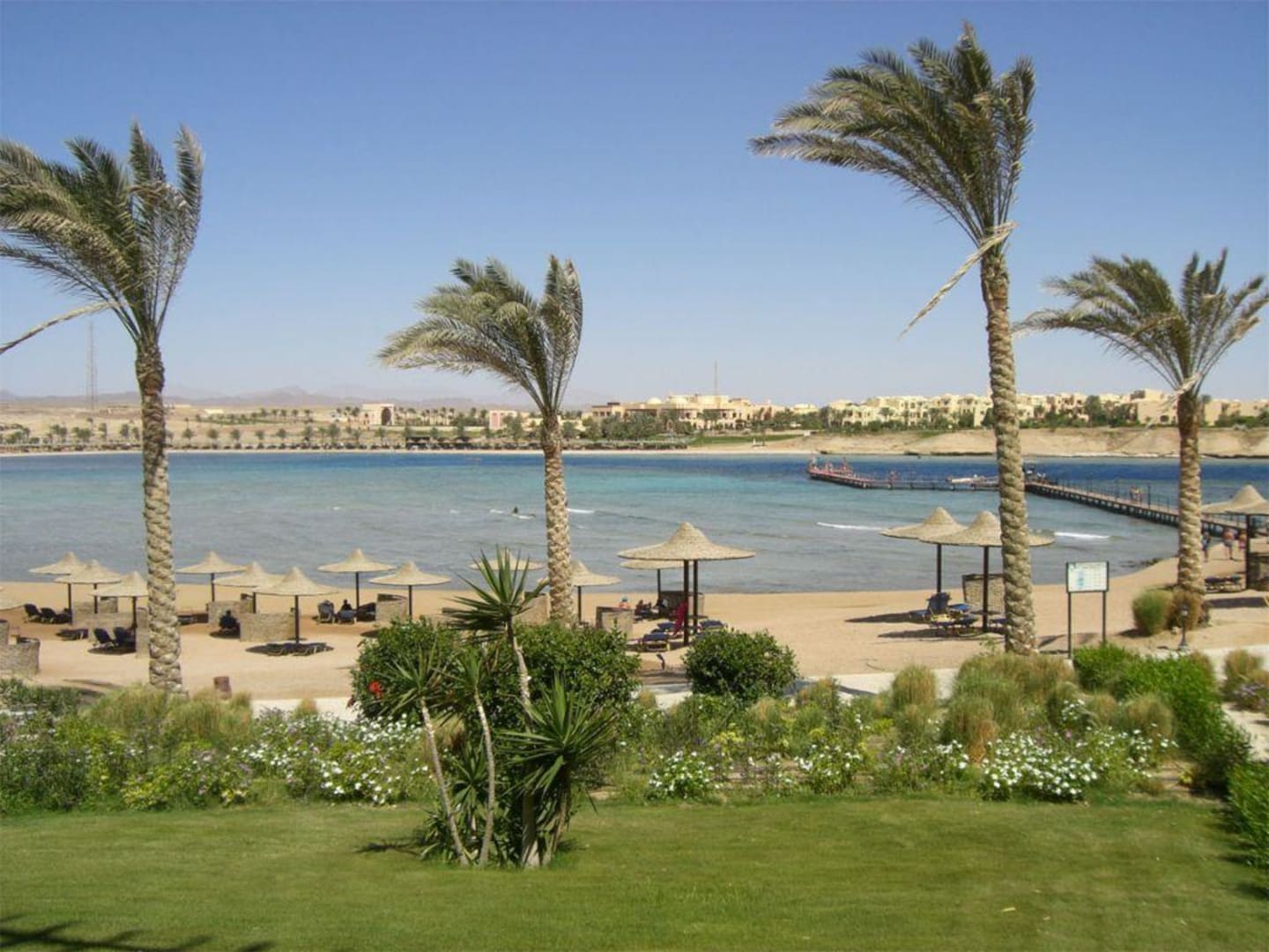 StrandBlick aufs Iberotel Coraya Beach im Vordergrund ein Teil vom Lamaya Strand und rechts der Steg ins Schnorchelparadies.