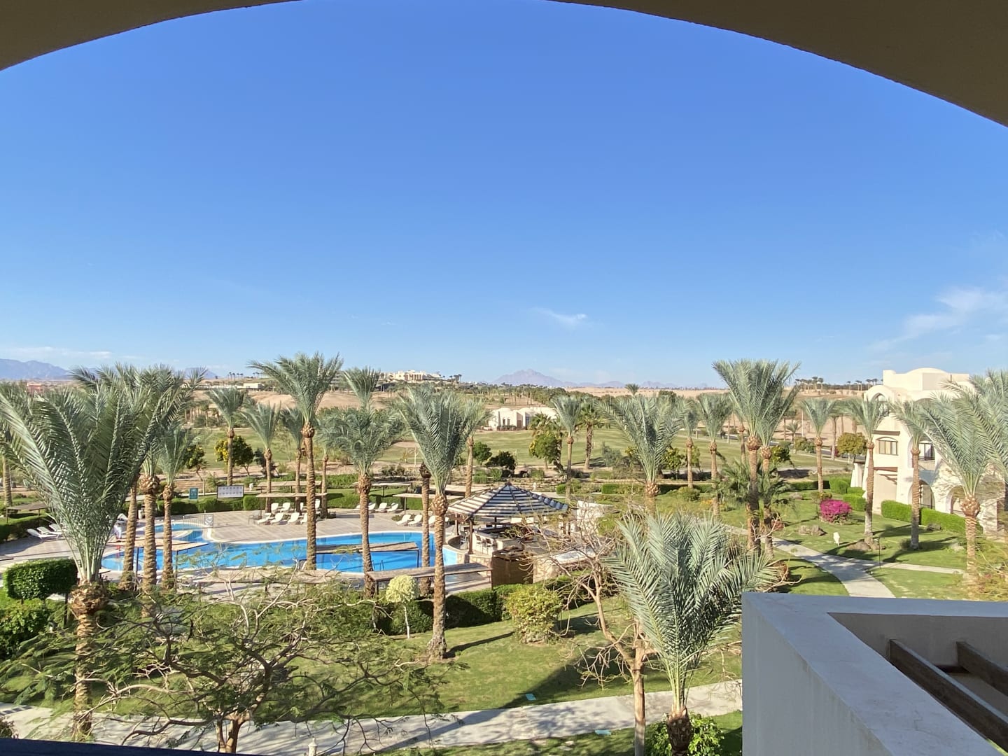 Von der Terrasse aus der Blick auf den Pool und die Berge im Hintergrund.