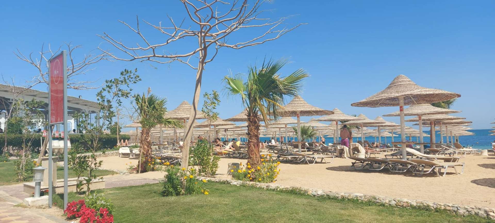 GartenanlageLinks zu sehen ein Teil vom Mittagsrestaurant, es war so schön jeden Tag mit Blick auf das Meer zu essen :)