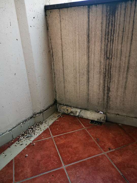 Balkon mit Schwalbenkot. Indem das Kondenswasser der Klimaanlage ewig und drei Tage flüssig wurde und über den gesamten Balkon floss. Wohlweislich keine Stühle oder ein Tisch vorhanden.