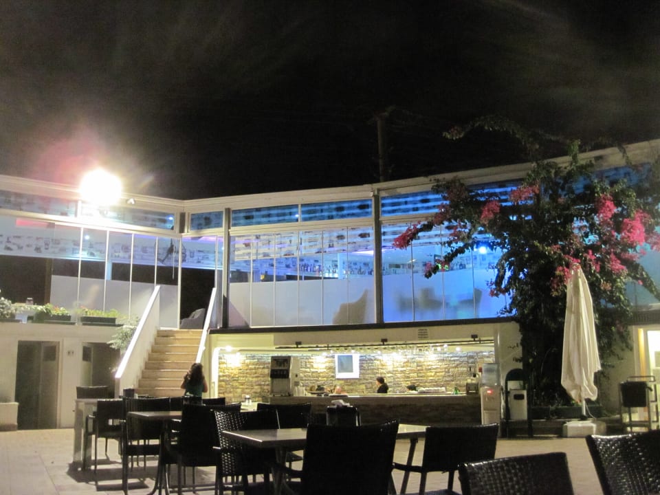 Außenbereich mit Bar und Wasserbehälter.