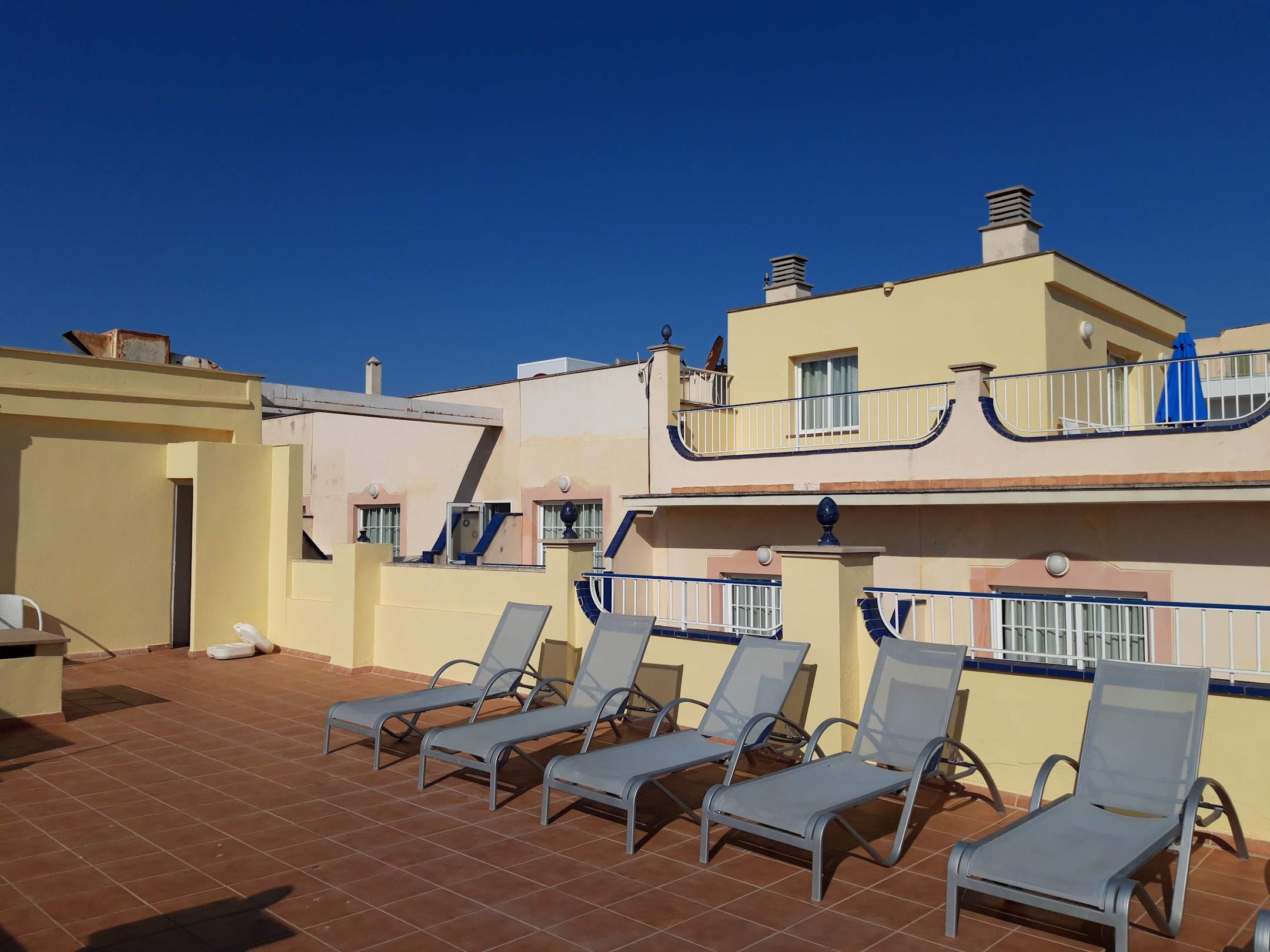 Dachterrasse mit ei eigen Liegen und einer Dusche aber ohne Sonnenschutz