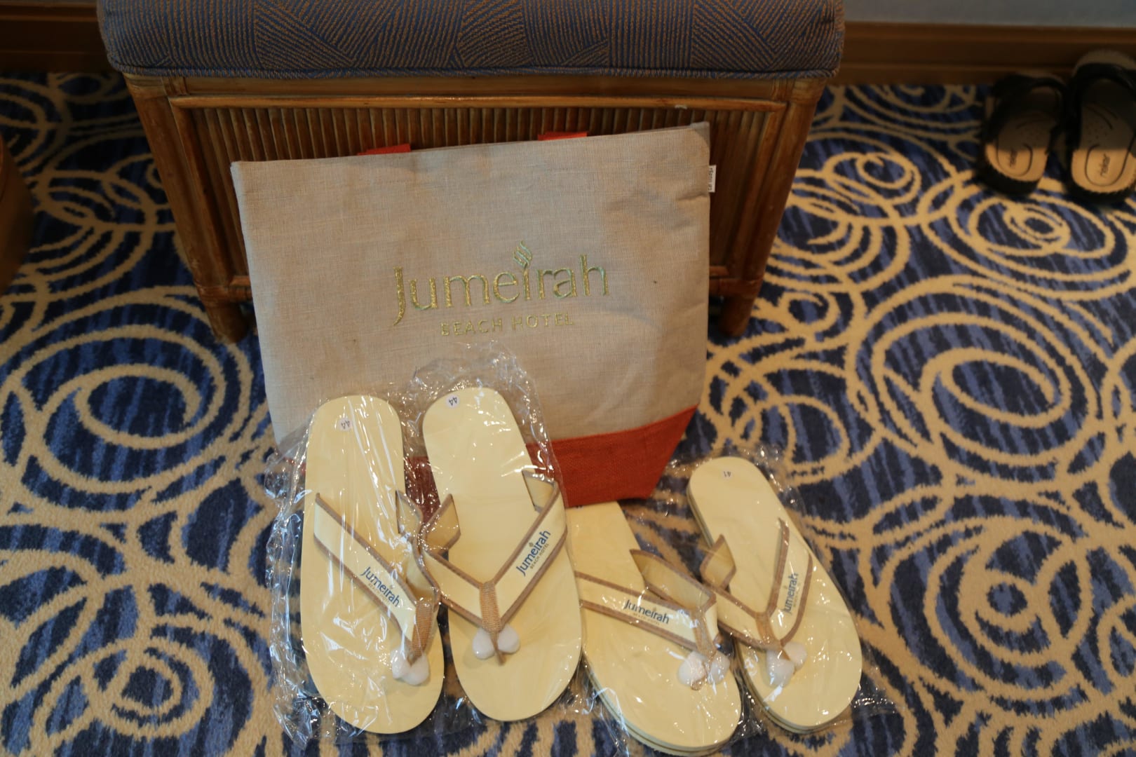 Strandtasche und Schlappen im Zimmer