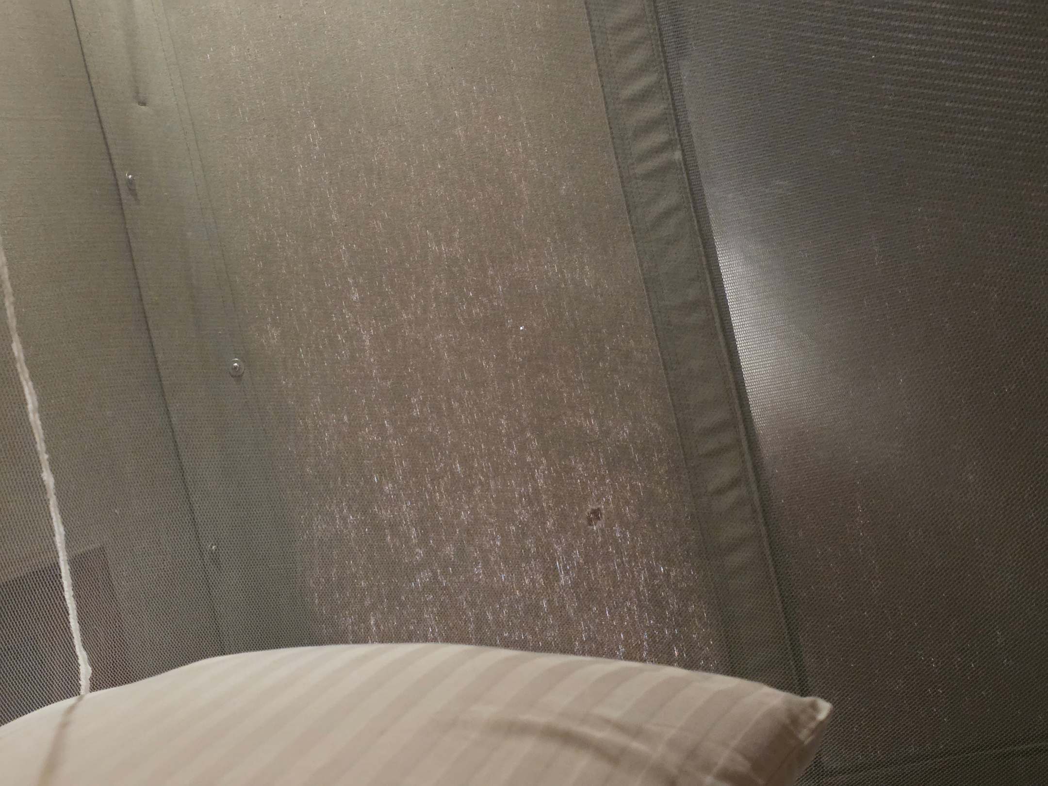 Moskitonetz über dem Bett mit den Löchern ohne Funktion