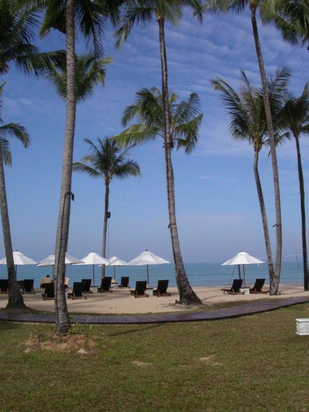 Sandstrand unter PalmenDa noch nicht so viele Besucher da sind, weil noch nur ein Fluegel freigegeben ist hat man noch die freie Wahl der Liegen.